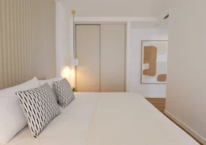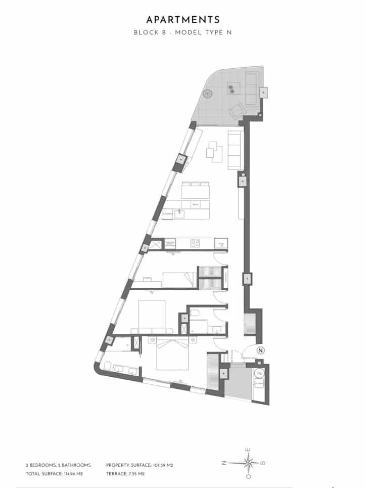 Amplio apartamento de 3 dormitorios y 2 baños con una superficie total de 114,93 m², diseñado para ofrecer comodidad y funcionalidad. El luminoso salón con cocina abierta totalmente equipada crea un espacio moderno con acceso directo a una terraza privada de 7,35 m² con vistas al mar. La vivienda cuenta con acabados de alta calidad, eficiencia energética (clasificación A), aire acondicionado y carpintería moderna. El edificio dispone de ascensor y garaje subterráneo (posible coste adicional según disponibilidad). El modelo de apartamento presentado está disponible en diferentes plantas del edificio.