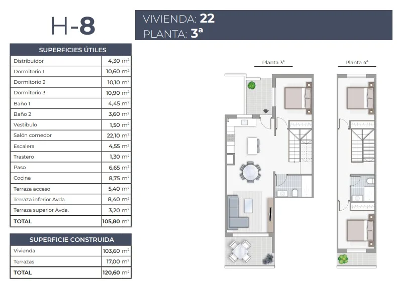 Ce duplex situé aux 3e et 4e étages, d’une surface de 106,3 m² avec une terrasse de 17 m², est une proposition idéale pour ceux qui recherchent de l’espace, du confort et un standard moderne dans un emplacement privilégié proche de la mer. Le bien dispose de 3 chambres et 2 salles de bain, avec des finitions de haute qualité et de nombreux équipements inclus : cuisine entièrement aménagée, placards intégrés dans les chambres avec éclairage LED, salles de bain complètes avec parois de douche en verre, radiateurs porte-serviettes noirs, ainsi qu’un éclairage intérieur dans tout le logement. Parmi les autres atouts, on retrouve des volets électriques dans le salon et des solutions économes en énergie pour la production d’eau chaude. Un pack électroménager est disponible en option pour environ 2 522 € (TVA incluse). Une place de parking en garage souterrain coûte environ 18 000 €, et l’unité extérieure de climatisation n’est pas incluse – prix sur demande.