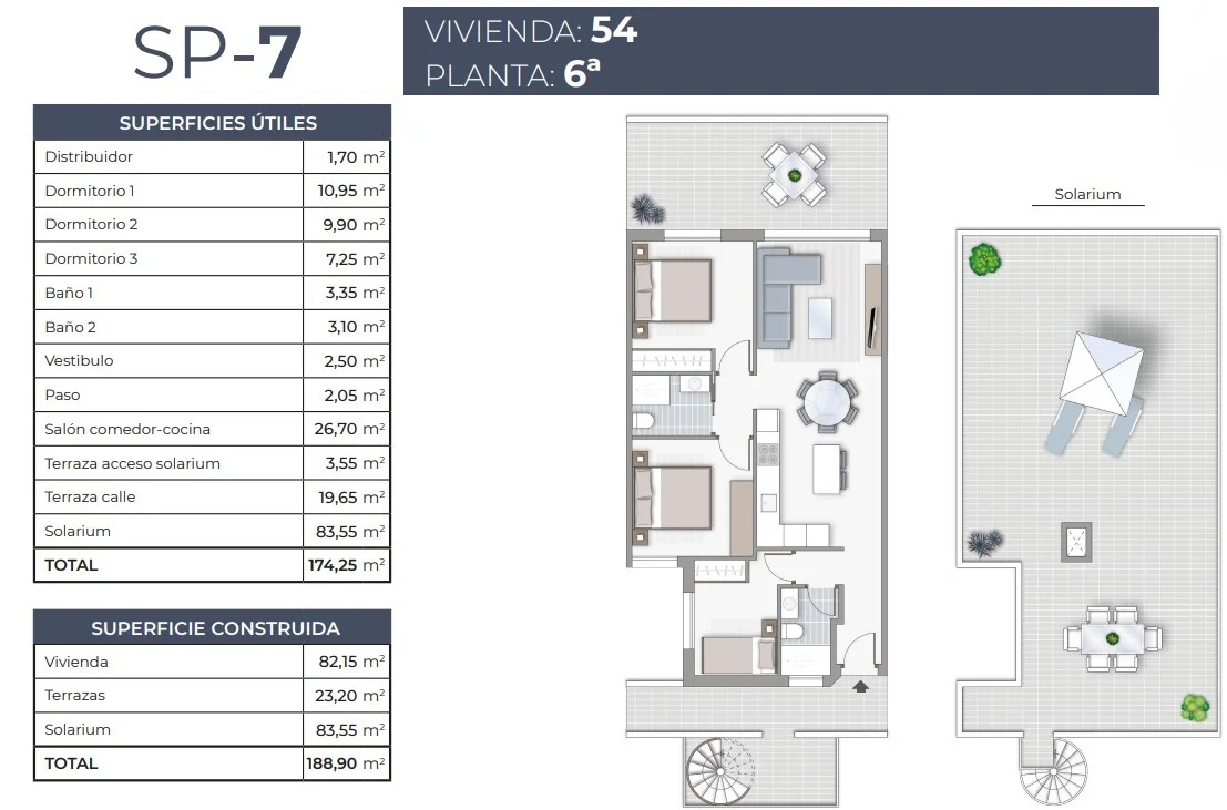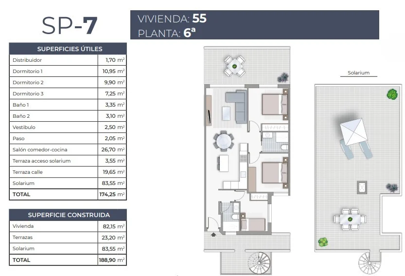 Ce penthouse d’une surface de 82,15 m² avec une terrasse/solarium privé exceptionnel de 103,71 m² est une opportunité rare pour ceux qui rêvent d’un grand espace extérieur et d’un style de vie méditerranéen. Le bien dispose de 3 chambres et 2 salles de bain, avec des finitions modernes et de nombreux équipements inclus : cuisine entièrement aménagée, placards intégrés dans les chambres avec éclairage LED, salles de bain complètes avec parois de douche en verre, radiateurs porte-serviettes noirs, ainsi qu’un éclairage intérieur dans tout le logement. Parmi les autres atouts, on retrouve des volets électriques dans le salon et des solutions économes en énergie pour la production d’eau chaude. Un pack électroménager est disponible en option pour environ 2 522 € (TVA incluse). Une place de parking en garage souterrain coûte environ 18 000 €, et l’unité extérieure de climatisation n’est pas incluse – prix sur demande.