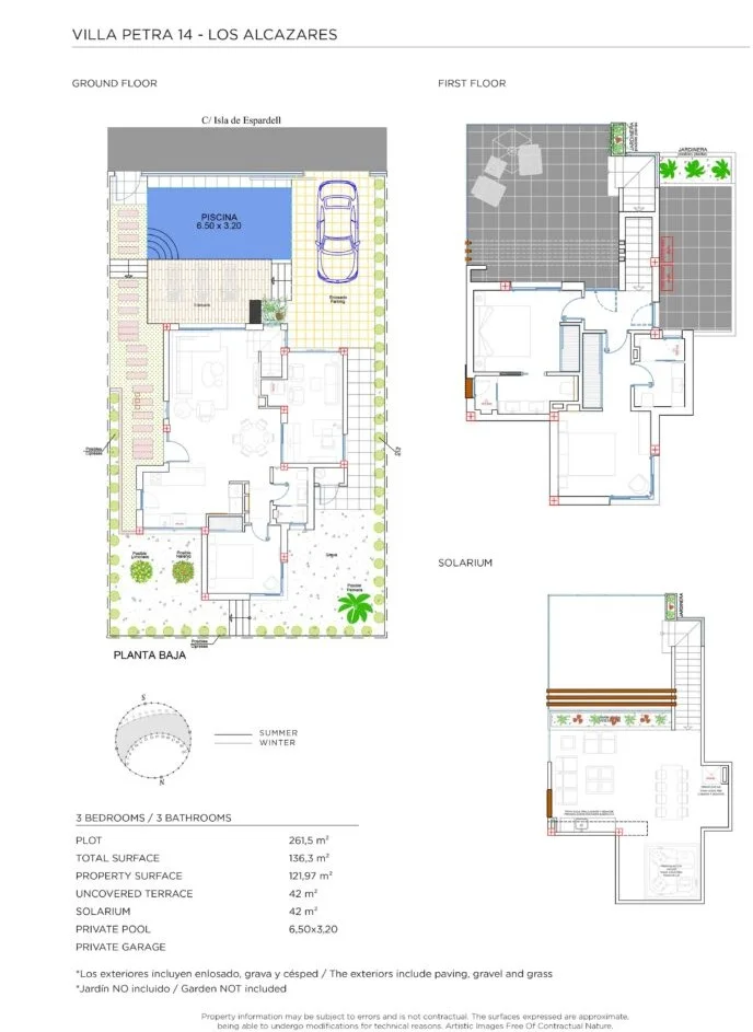 Nowoczesna willa z 3 sypialniami i 3 łazienkami o łącznej powierzchni 178,3 m², położona na działce o powierzchni 261,5 m². Jasne i funkcjonalne wnętrze obejmuje przestronny salon z jadalnią oraz otwartą kuchnią, tworząc komfortową przestrzeń dzienną z bezpośrednim wyjściem na taras o powierzchni 42 m². Nieruchomość oferuje nowoczesne wykończenie oraz przemyślany układ pomieszczeń. Do dyspozycji mieszkańców jest prywatny basen (3,20 x 6,50 m), prywatne miejsce parkingowe lub garaż, komórka lokatorska oraz przestronne solarium o powierzchni 42 m², idealne do relaksu.