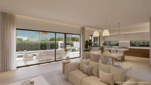 Nowoczesna, parterowa willa z 3 sypialniami i 3 łazienkami o łącznej powierzchni 205 m², usytuowana na przestronnej działce o powierzchni 700 m². Jasne i funkcjonalne wnętrze obejmuje salon z jadalnią oraz otwartą kuchnią, tworząc komfortową przestrzeń dzienną z bezpośrednim wyjściem na taras o powierzchni 65 m². Nieruchomość wyróżnia się wysokiej jakości wykończeniem, dużymi przeszkleniami oraz energooszczędnymi rozwiązaniami (klasa A). Do dyspozycji jest prywatny basen (9,20 x 3,50 m), rozległy ogród, prywatny garaż oraz liczne strefy wypoczynkowe na zewnątrz. Dodatkowym atutem jest przestronne solarium o powierzchni 155 m² z pergolami (75 m²), idealne do stworzenia strefy relaksu, jadalni na świeżym powietrzu lub miejsca pod jacuzzi.