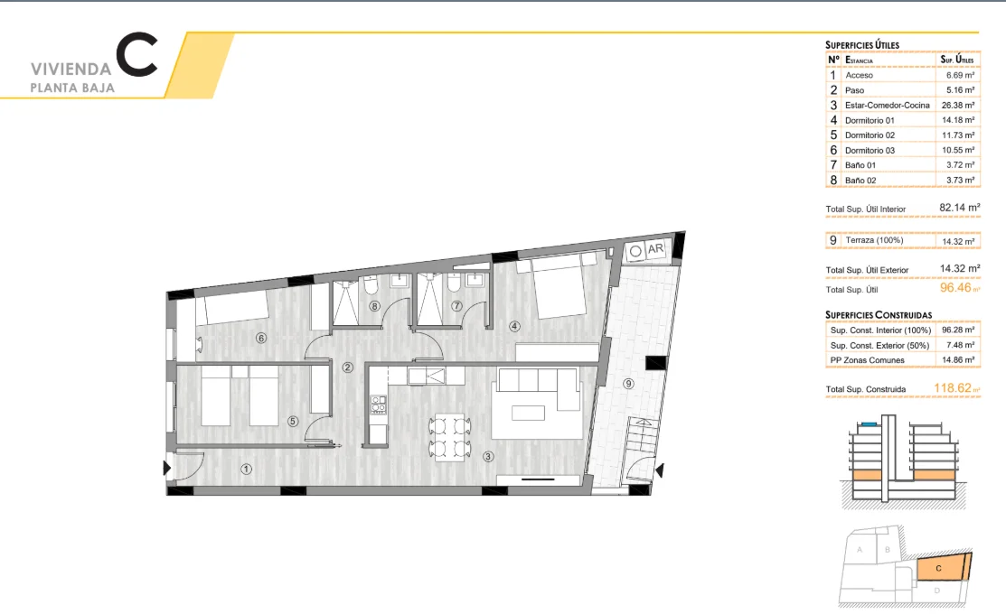 A spacious ground-floor apartment with a total area of 118 m², offering a comfortable layout with three bedrooms and two bathrooms. The interior has been designed with a strong focus on functionality and everyday comfort. The apartment features a bright, modern open-plan kitchen connected to the living and dining area, fully equipped bathrooms with shower enclosures, built-in wardrobes, and complete lighting throughout the property. Additional comfort is provided by underfloor heating in the bathrooms and pre-installation for ducted air conditioning. A major advantage is the private terrace, perfect for outdoor relaxation. There is an option to purchase a parking space in the underground garage for €20,000.