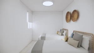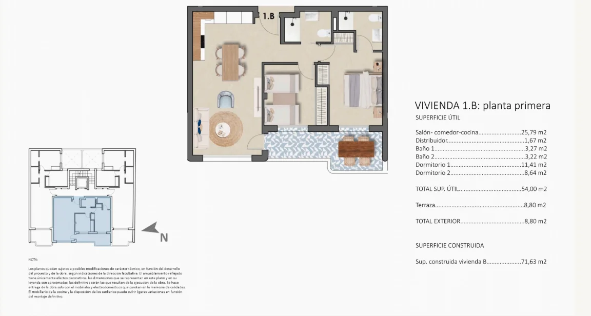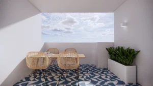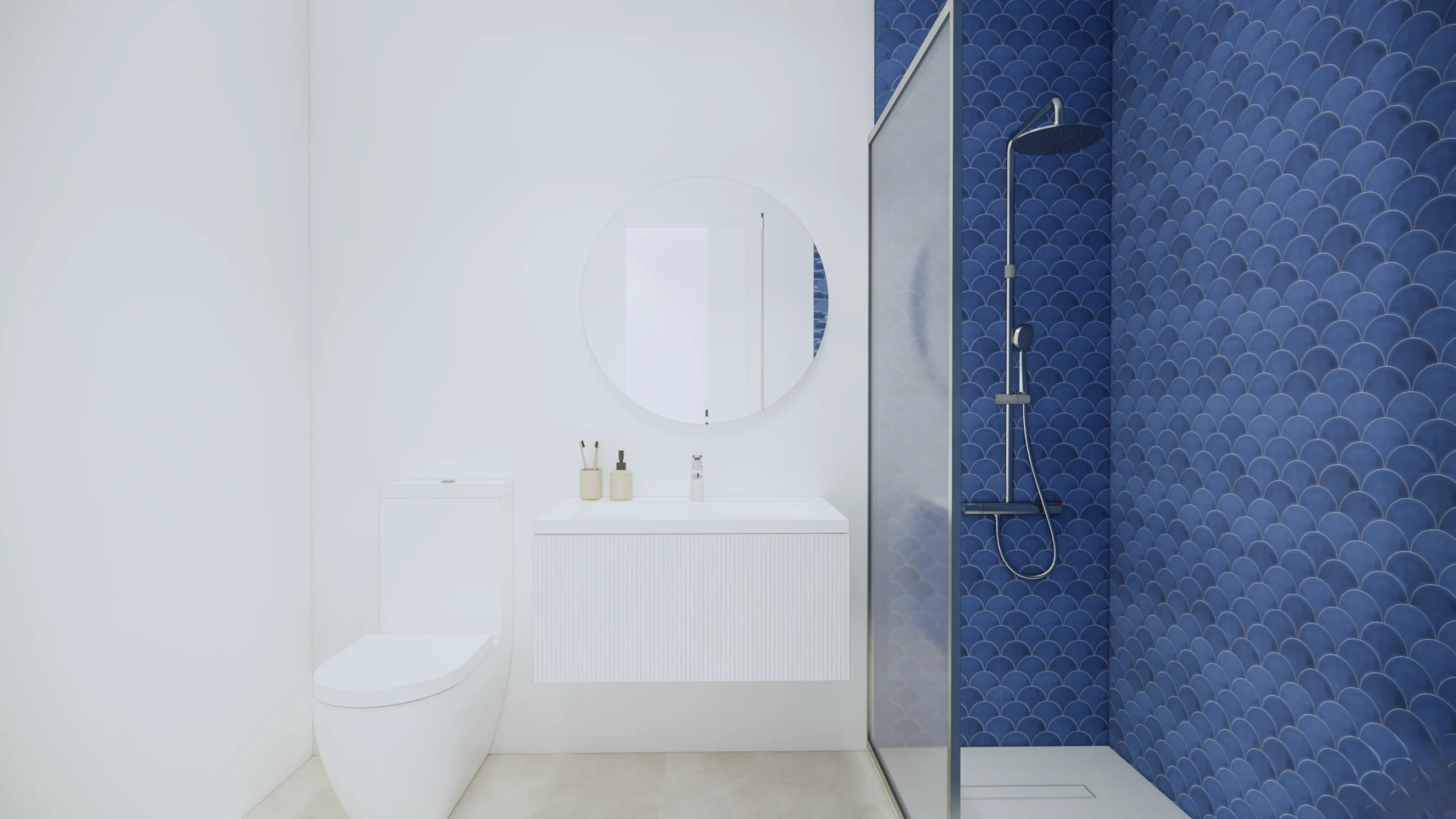 The bathrooms are fully finished and equipped with washbasins integrated into vanity units, toilets, and showers with trays and tempered glass enclosures. Chrome-finished single-lever fittings, rain showers, hand showers, and mirrors complete the modern bathroom design. The apartment benefits from a private terrace of 8.28 m², ideal for outdoor relaxation.