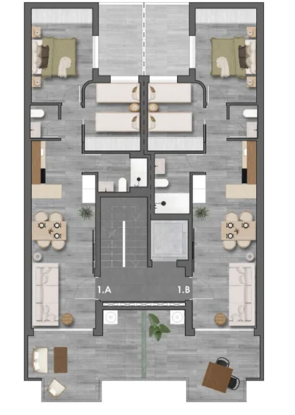 A modern apartment located on the first floor of the building, offering a comfortable and functional layout with 2 bedrooms and 2 bathrooms and a total living area of 68.31 m². The interior has been designed for everyday comfort, featuring a bright living area with an open-plan kitchen seamlessly connected to the lounge and dining space. The kitchen is fully fitted with upper and lower cabinets, a durable worktop, cooking and baking appliances, and a sink with a mixer tap. The bathrooms are fully finished and equipped with vanity units with integrated washbasins, toilets, and showers with trays and glass enclosures. Modern fittings, rain showers, and mirrors complete the interior.