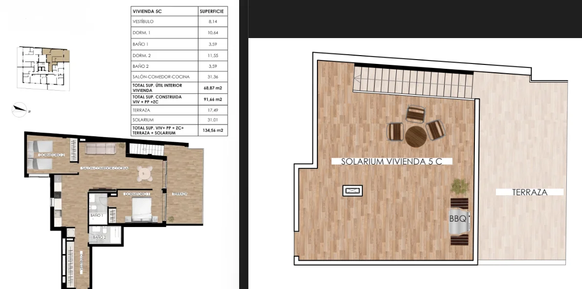 A modern penthouse located on the top floor of the building, offering a bright and comfortable living space with two bedrooms and two fully equipped bathrooms. The interior has been carefully finished and is ready to move in. The property features a fully fitted kitchen with household appliances, built-in wardrobes, complete bathrooms with fittings and shower enclosures, as well as lighting throughout the apartment. A key highlight is the spacious terrace and a private 31 m² solarium, ideal for relaxing and outdoor entertaining. Additional features include underfloor heating in the bathrooms, pre-installation for ducted air conditioning, and a video intercom system. There is an option to purchase a parking space in the underground garage for €15,000.