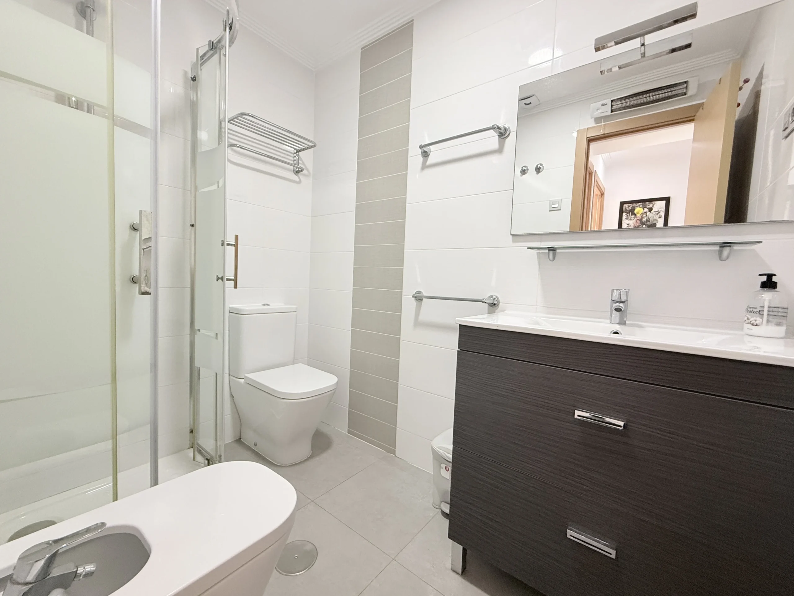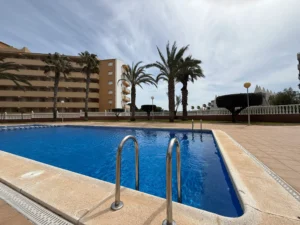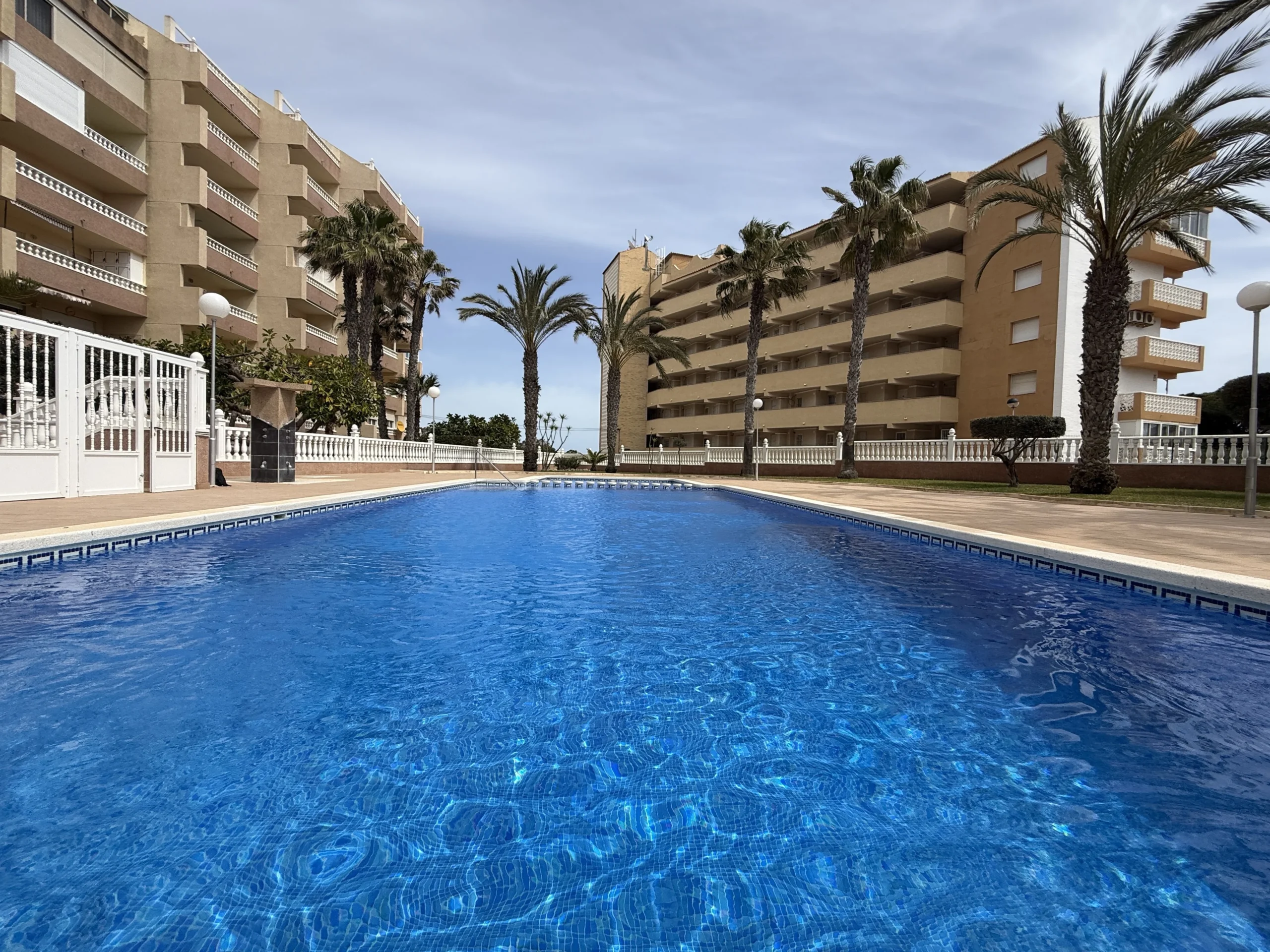 A covered private parking space with automatic gate access is included. The building offers elevator access, and residents benefit from a private swimming pool with showers.